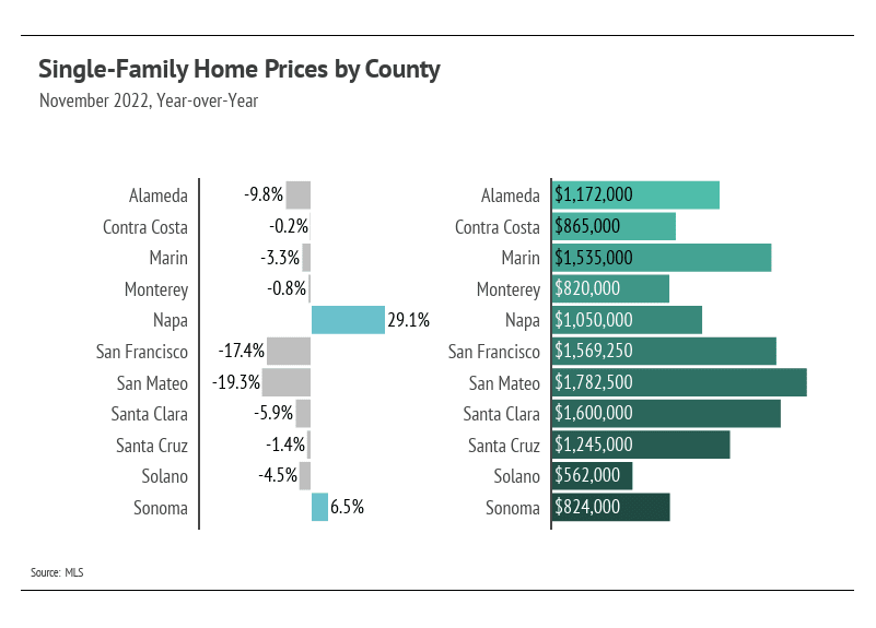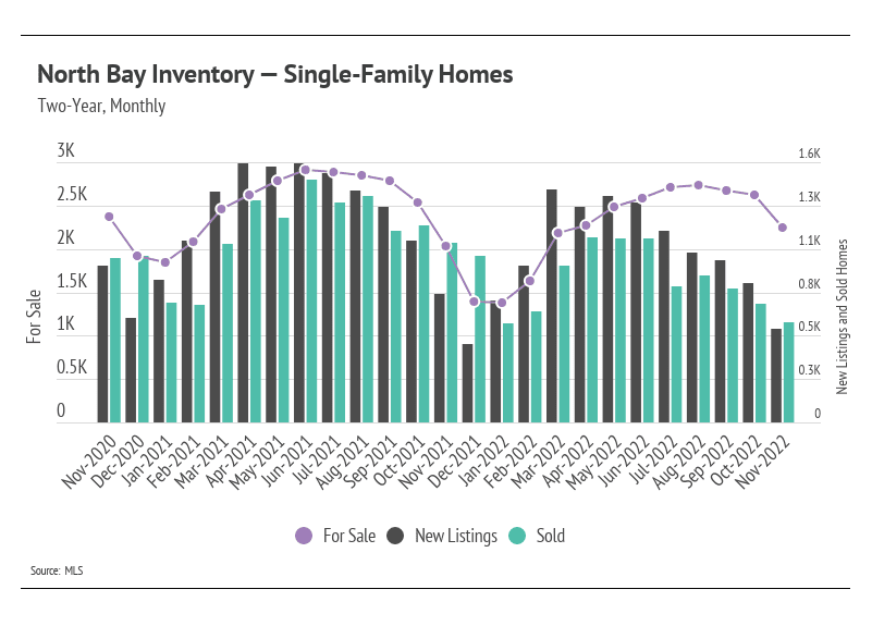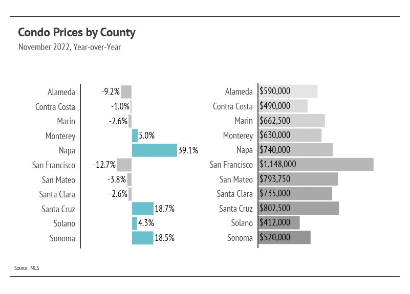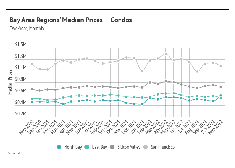 As we mentioned in the Big Story, the market is cooling on both the buy and the sell sides. When there are fewer sellers, there are also fewer buyers, because some buyers are selling their homes to move others in the same market. New listings have declined faster than sales, causing inventory to decline near the all-time low level we experienced last winter. However, the key difference is that fewer buyers are on the market — so, even with low inventory, buyers can still find the home that’s right for them. The low inventory has insulated prices from a major reversal. In fact, the median North Bay condo price reached an all-time high in November. Although prices have contracted across most of the Bay Area, especially single-family homes in Silicon Valley and San Francisco, they have maintained price gains over the past 24 months.