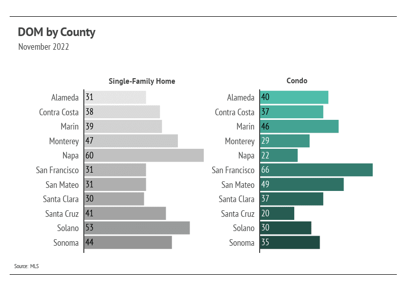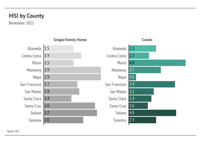 Months of Supply Inventory (MSI) quantifies the supply/demand relationship by measuring how many months it would take for all current homes listed on the market to sell at the current rate of sales. The long-term average MSI is around three months in California, which indicates a balanced market. An MSI lower than three indicates that there are more buyers than sellers on the market (meaning it’s a sellers’ market), while a higher MSI indicates there are more sellers than buyers (meaning it’s a buyers’ market). MSI has trended higher (from a sellers’ market toward balance) since spring, but despite the changing market environment, single-family home MSI still indicates a sellers’ market, but just barely for Monterey and Napa counties. The condo markets still mostly favor sellers, with the exception of the Marin, San Francisco, and Solano markets, which favor buyers.