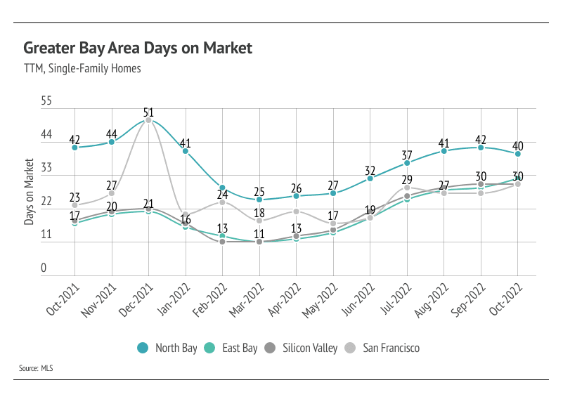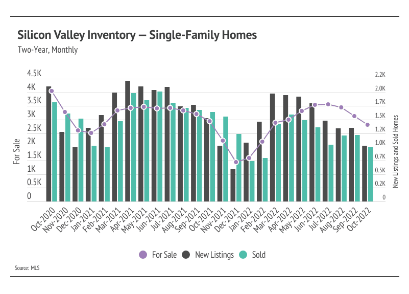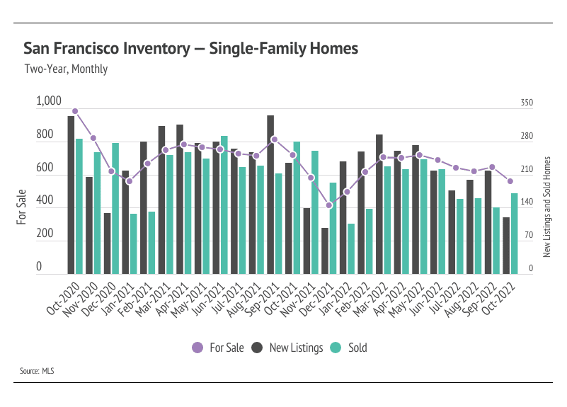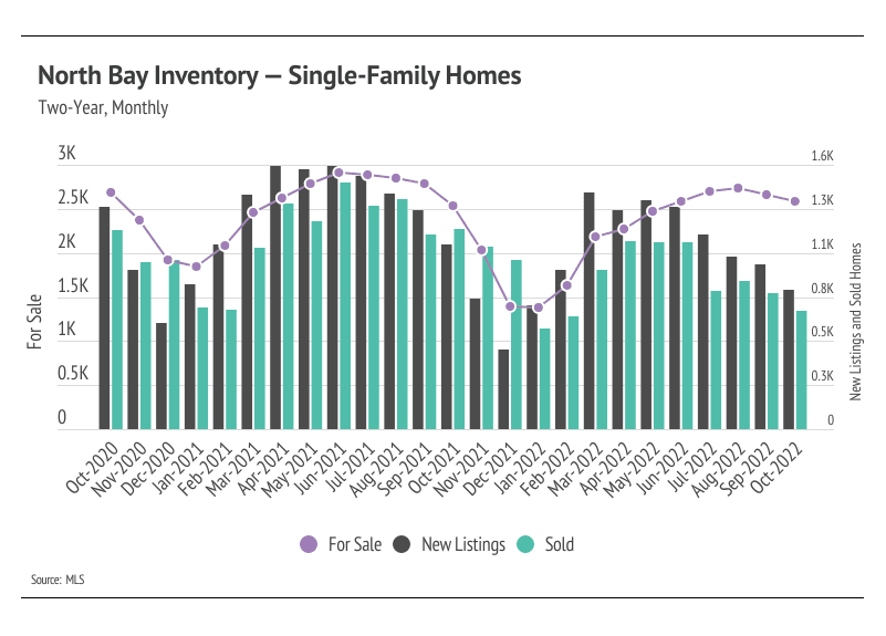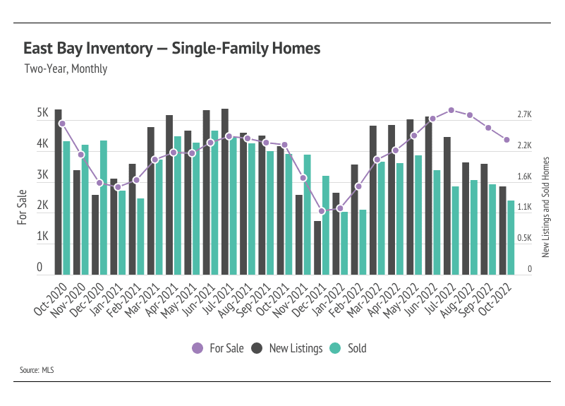 Single-family home and condo sales and new listings declined month-over-month, a trend that will likely continue through the rest of the year. The Bay Area, along with the rest of the country, has not returned to pre-pandemic inventory levels after the buying boom last year. Now that we’re through most of 2022, we can see just how significant sales were in 2021 by comparison, especially in the summer months. From May through September of last year, 35,511 single-family homes and condos sold. During the same period this year, 25,595 homes sold, a 28% decline. Far fewer new homes have come to market in 2022, and the rising rate environment has dropped demand as well. We can tie new listings not only to supply, but also to demand, because sellers are often buying, too. Softening demand has brought the market closer to balance despite declining inventory.