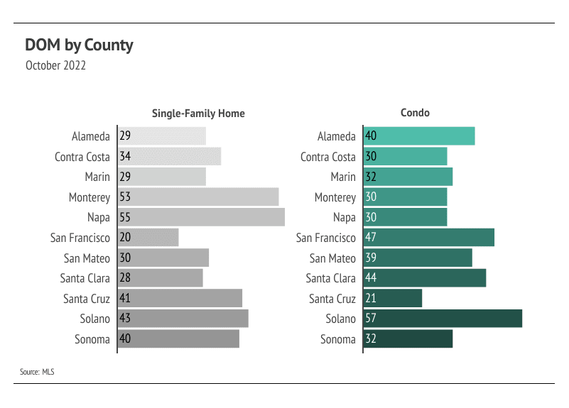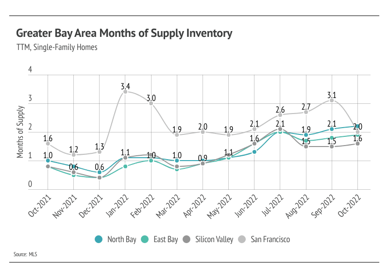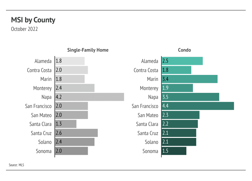Months of Supply Inventory (MSI) quantifies the supply/demand relationship by measuring how many months it would take for all current homes listed on the market to sell at the current rate of sales. The long-term average MSI is around three months in California, which indicates a balanced market. An MSI lower than three indicates that there are more buyers than sellers on the market (meaning it’s a sellers’ market), while a higher MSI indicates there are more sellers than buyers (meaning it’s a buyers’ market). MSI has trended higher (toward balance) since the spring due to the changing market environment. However, we are still in a sellers’ market for most of the Bay Area, as demand for homes has remained high relative to supply. Currently, MSI indicates a balanced market for Napa condos and a buyers’ market for Napa single-family homes and San Francisco condos.