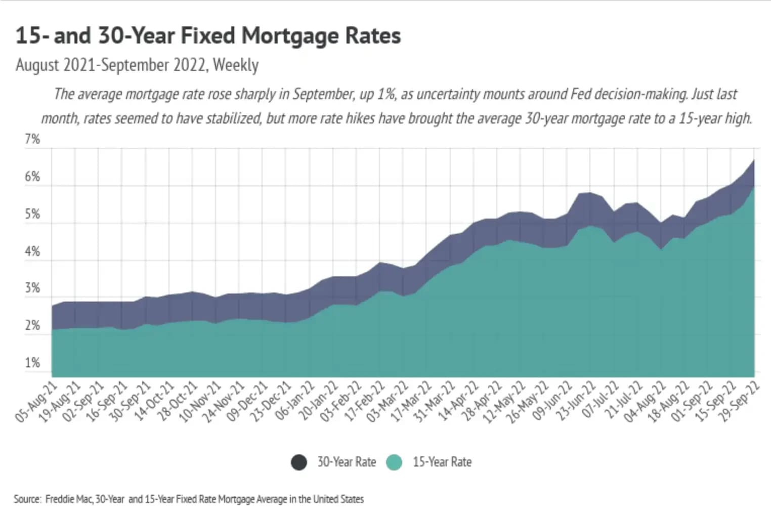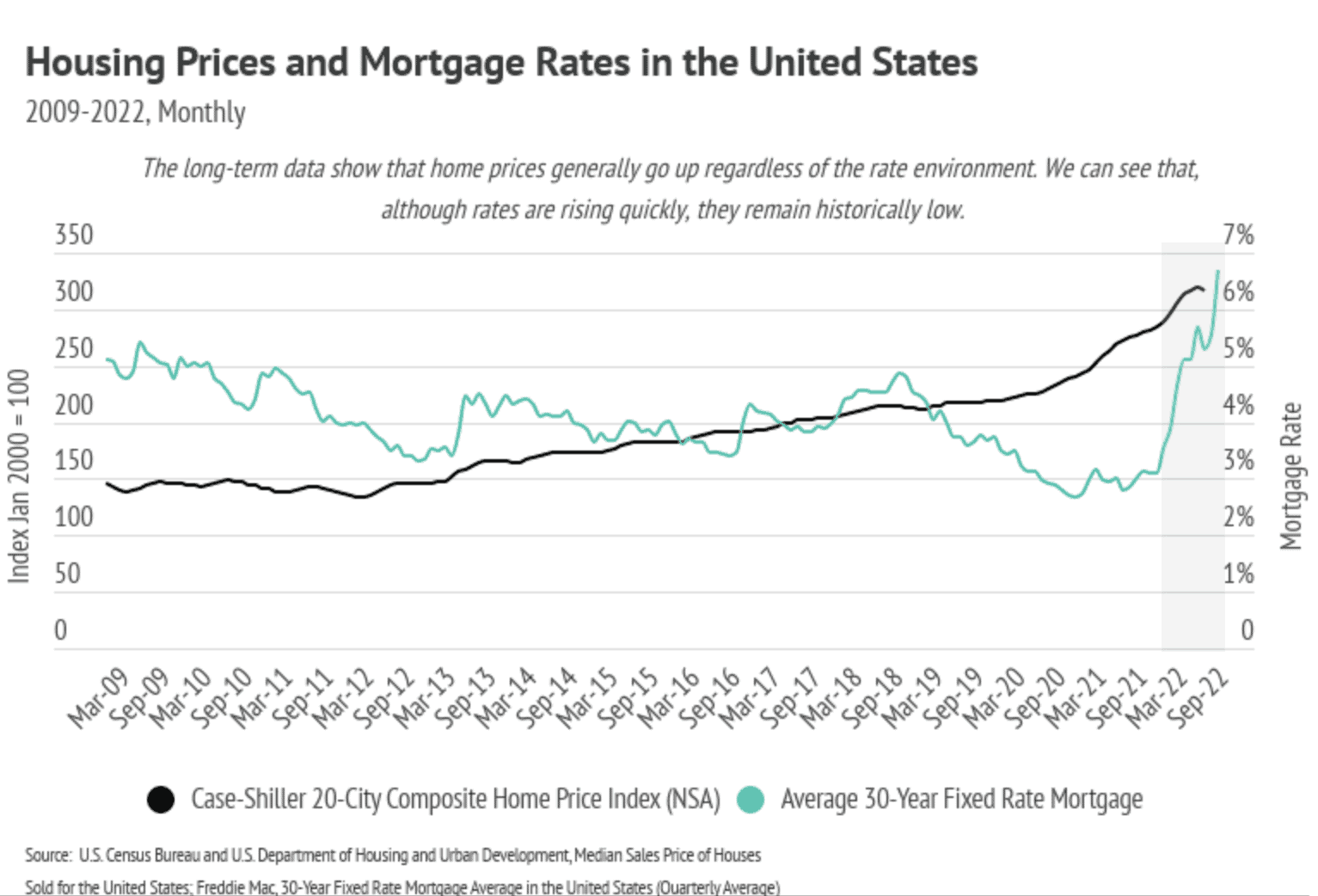 The Fed provided huge incentives to buy homes as part of its easy monetary policy during the pandemic by purchasing Mortgage-Backed Securities (MBS) and dropping interest rates. MBS plays an integral role in home financing by allowing banks to bundle and sell mortgage loans, thereby turning the bank into an intermediary between the financier and financial markets (investors). Banks get some fees, and investors, rather than the bank, get the interest from the bundle of mortgages, so in many ways, the bank facilitates the loan but investors are the ones really lending the buyer the money. The Fed was a huge investor in 2020 and 2021, doubling its MBS holdings to $2.7 trillion. However, the Fed isn’t buying any more MBS and, in fact, would like to sell — but can’t do so without taking huge losses. Additionally, mortgage rates have jumped dramatically in 2022, more than doubling, which shines a light on just how unique 2021 was for home buying.