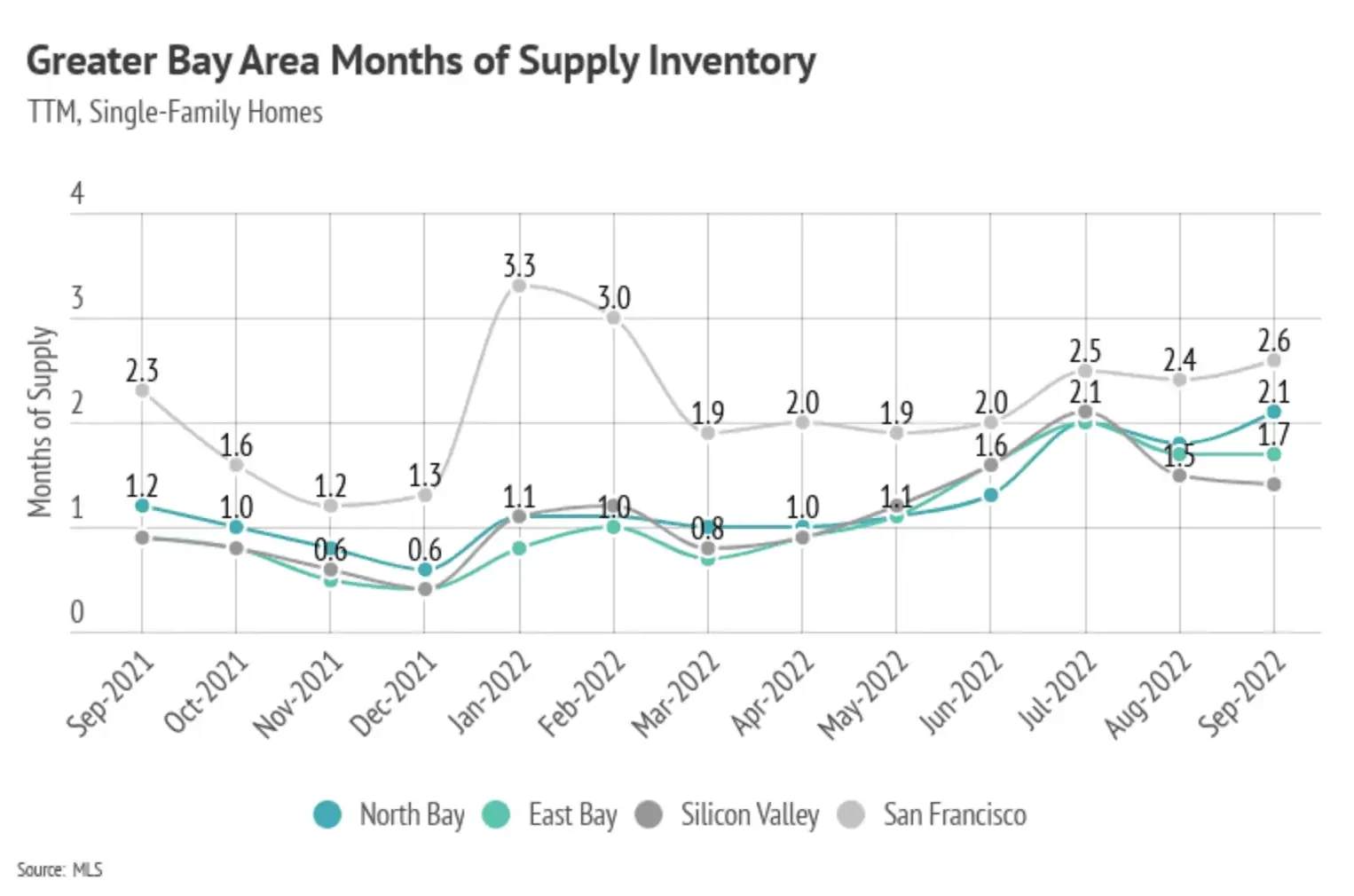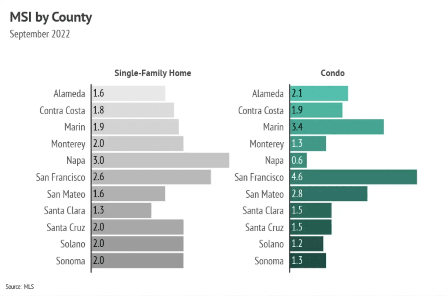 Months of Supply Inventory (MSI) quantifies the supply/demand relationship by measuring how many months it would take for all current homes listed on the market to sell at the current rate of sales. The long-term average MSI is around three months in California, which indicates a balanced market. An MSI lower than three indicates that there are more buyers than sellers on the market (meaning it’s a sellers’ market), while a higher MSI indicates there are more sellers than buyers (meaning it’s a buyers’ market). MSI has drifted higher (toward balance) over the past six months but remained far below three months of supply across the Bay Area, indicating we are still firmly in a sellers’ market, with the exception of San Francisco, which is close to balanced.